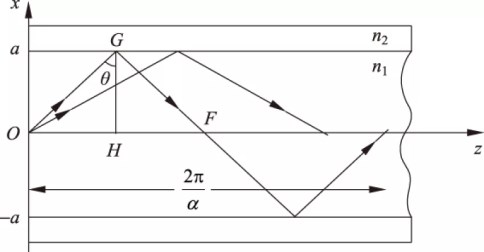 我們在圖6的階躍折射率多模光纖中選取光線OGF進(jìn)行分析,假定它的空間周期也為2π/α,則有