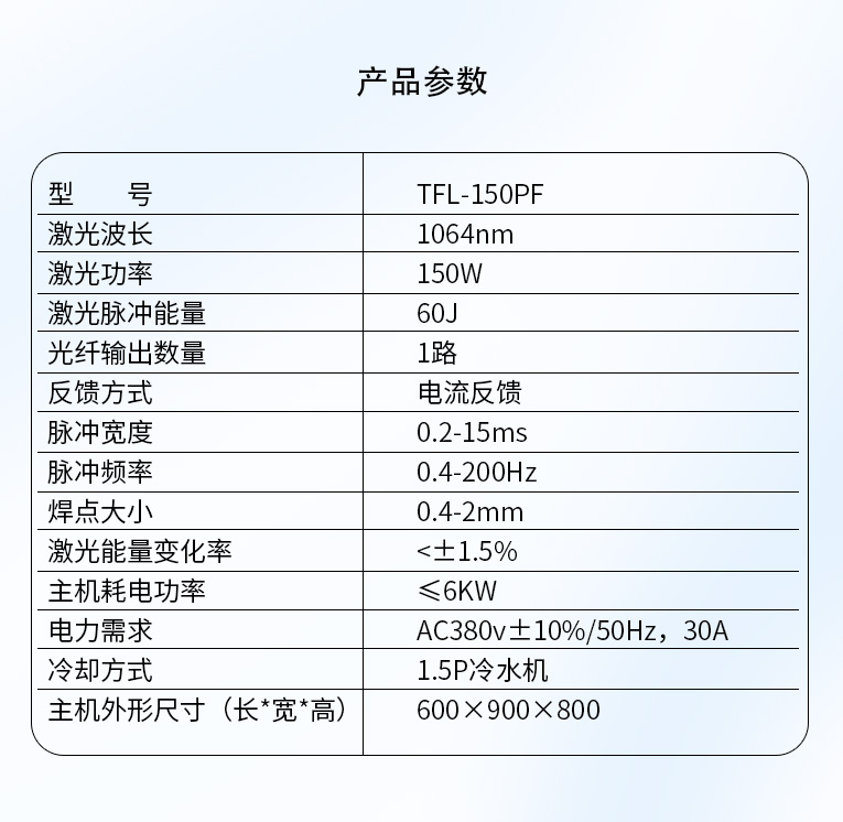 通發(fā)激光TFL-150PF光纖激光焊接機,采用能量反饋控制模式,能量較穩(wěn)定,光纖傳輸光束質量好,適合0.5mm以下金屬不銹鋼板材的精密激光焊接,是批量五金產品中小功率焊接專用機型。