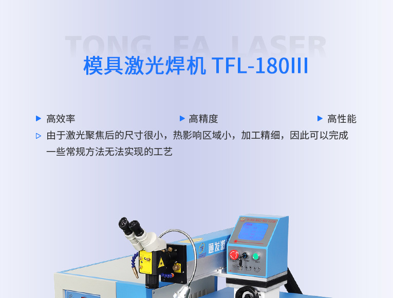 普通型模具激光焊機TFL-180Ⅲ是通發(fā)激光公司的模具激光焊機中銷量較大的傳統(tǒng)型,配置激光頭手搖升降與工作臺按鈕電動升降實現(xiàn)焊接不同厚度模具的激光焊加工。本系列機型適用于各類精密注塑模具激光補焊、壓鑄模具激光修補焊接;同時也適合鑄件沙孔激光修補、模具磨損激光修復(fù)、過切加工等的激光修補;各類金屬結(jié)構(gòu)件激光焊接加工、金銀首飾激光焊接加工。