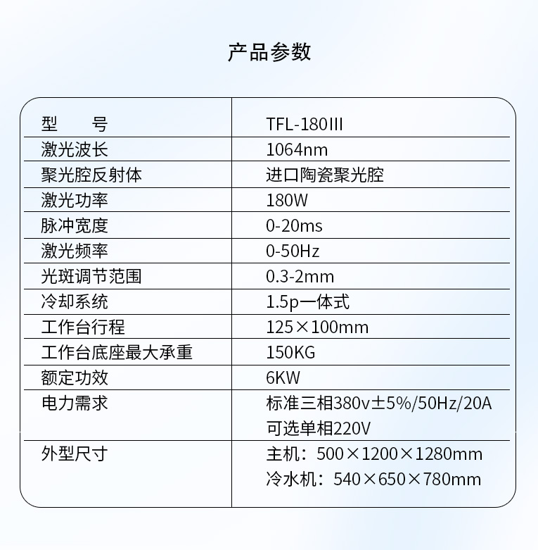 環(huán)境溫度:攝氏4度-攝氏32度。設(shè)備運行時,環(huán)境溫度不可以超過攝氏32度,因為激光電源部分,功率很高,一些功率器件運行時發(fā)出熱量需要及時散發(fā)出去,而環(huán)境溫度太高會導(dǎo)至不能正常散熱,會引起整個系統(tǒng)的工作不穩(wěn)定,甚至損壞。而冬天的時候,需要嚴(yán)防冷卻水結(jié)冰,因為激光晶體、氙燈、聚光腔都充滿了水,結(jié)冰會直接導(dǎo)致這些器件的損壞。冬天時如長時間不運行情況下,將腔內(nèi)的水排空;如再開機前,先重新加水,打開電源空氣開關(guān),先行主機不開,只開水機空機運行10分鐘,等水溫回復(fù)到攝氏4 度以上,再開主機。(強烈要求不能將設(shè)備放于室外或者低溫結(jié)冰的情況下使用,否則極易損壞設(shè)備)