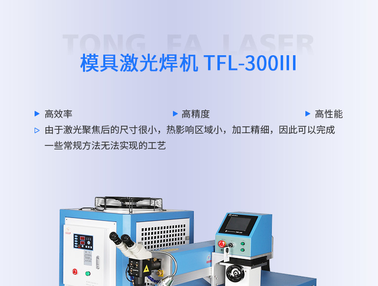 通發激光TFL-300Ⅲ大功率模具激光焊機,比普通激光焊機修復模具效率快1.5-2倍,適合0.3-0.6激光焊絲,大功率更適合修復鈹銅模具、鋁模等較難修復的模具。