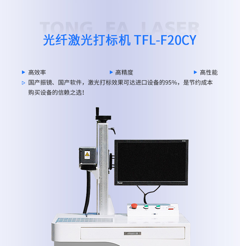 通發(fā)激光研發(fā)TFL-F20CY激光打標(biāo)機,金屬材料和塑膠材料都進行打標(biāo)加工,本激光鐳雕機配置成熟的20W和30W國產(chǎn)光纖激光器,國產(chǎn)振鏡、國產(chǎn)軟件,性價比高,激光打標(biāo)效果可達進口設(shè)備的95%,是節(jié)約成本購買設(shè)備的信賴之選!