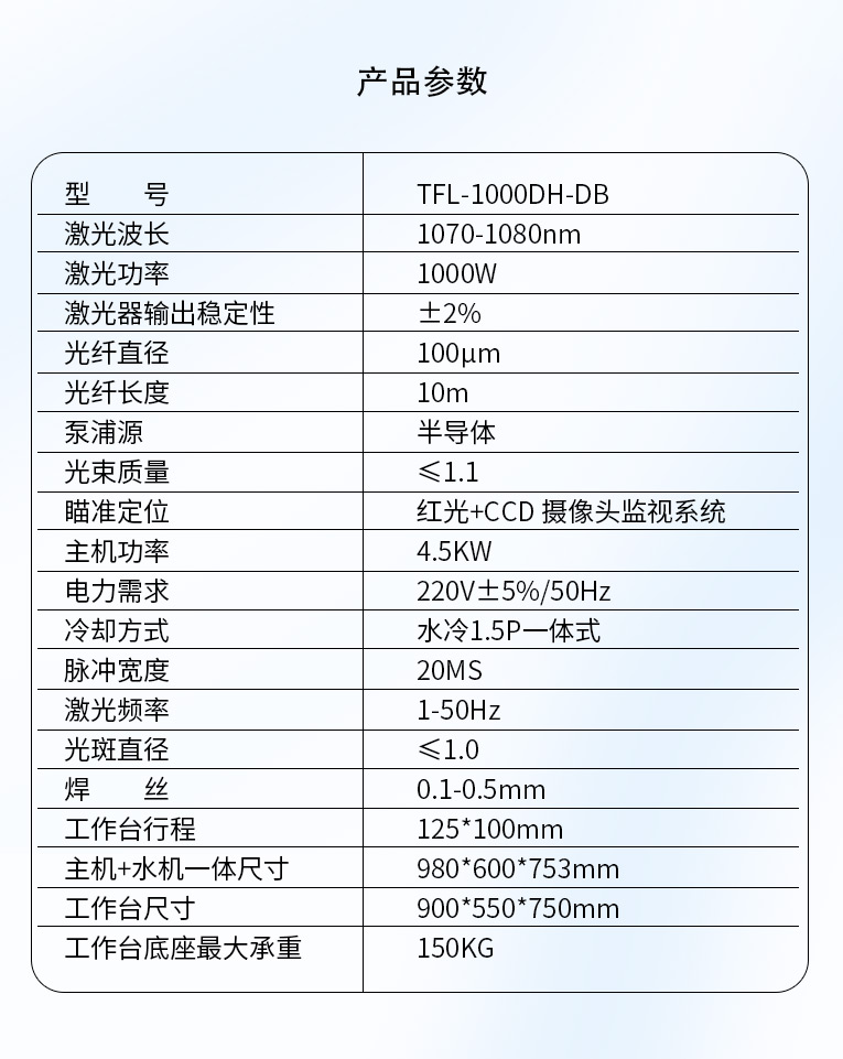 采用光纖激光器,反射率高,能量強,免維護(hù),免調(diào)光,功耗少,相比傳統(tǒng) 模具焊來說,體積小,安全,穩(wěn)定性好超長使用壽命。 1000W光纖激光器,滿足銅、鋁焊接量大的模具及產(chǎn)品焊接加工需要。 高承重底座及工作臺,保持輕便靈活的優(yōu)點,同時提供更高承載能力。 配備.1.5P大功率一體式水冷水機,保證了大功率焊接的穩(wěn)定性。